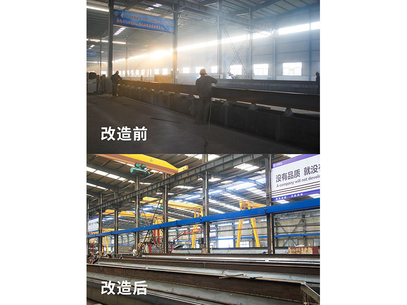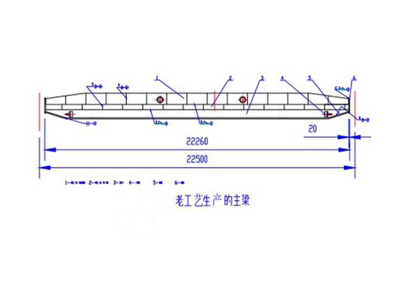 電動(dòng)單梁起重機(jī)主梁原來(lái)主要采用U型槽加筋板焊接工字鋼,然后焊接兩側(cè)板再聯(lián)接端梁的方式制作。該工藝缺點(diǎn)是U型槽生產(chǎn)效率低、勞動(dòng)強(qiáng)度大、焊接費(fèi)用高、焊接工序耗時(shí)較長(zhǎng),焊接變形量大,焊接過(guò)程產(chǎn)生較多電焊煙塵,污染嚴(yán)重,在進(jìn)行多段拼板、焊接、整形的過(guò)程中,焊接質(zhì)量難保證,時(shí)有主梁橫向焊縫產(chǎn)生裂紋缺痕。